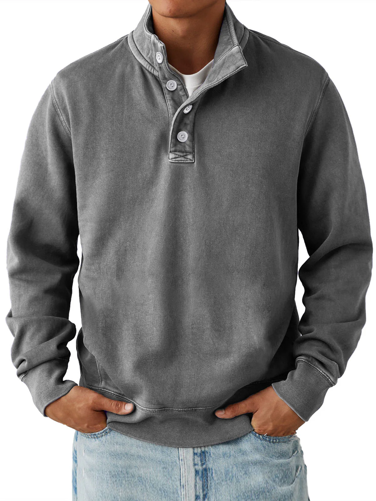• Men's Casual Stand Collar Button Solid Color Comfortable Sweatshirt