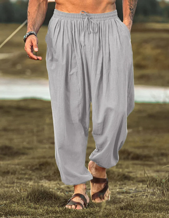 Features --- The men baggy harem pants features with loose fit, wide leg, solid color, ankle length, two deep side pockets, stretchy waist with adjustable drawstring.